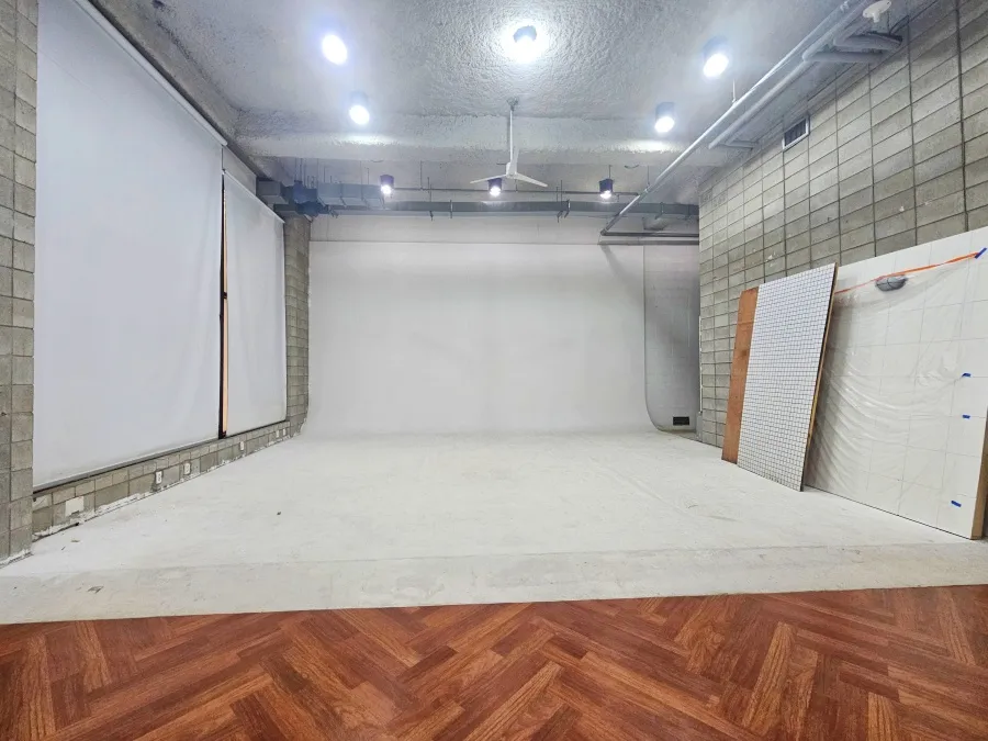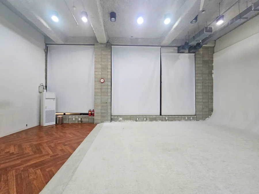 이 논현동 스튜디오의 핵심은 바로 호리존입니다. 폭이 무려 8미터에 달하는 대형 호리존이 완비되어 있어, 차량이나 대형 가구 등 규모감 있는 소품을 활용한 촬영이 가능합니다. 이 정도 크기의 호리존은 강남권 스튜디오 중에서도 희소성이 높습니다. 냉난방기 3대(스탠드 1, 벽걸이 2)가 이미 설치되어 있어, 별도의 시설 투자 없이 곧바로 쾌적한 환경에서 작업을 시작할 수 있습니다. 화장실은 층간 외부에 분리되어 있어 깔끔하게 사용할 수 있으며, 주차는 자주식으로 1대 가능합니다. 강남구청역 도보 7분 거리로, 모델이나 스태프들의 접근성도 진짜 좋습니다.